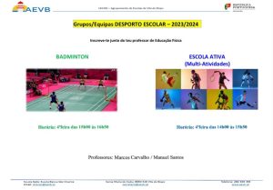 Desporto Escolar 2023/2024Sem categoria / By admin O Desportor Escolar está prestes a começar na Escola Básica de S. Vicente. Consulta os horários e grupos no cartaz.